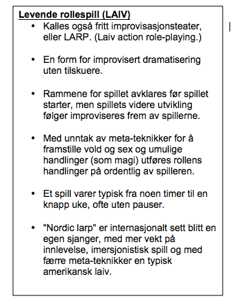 De andre to fant enda større inspirasjon i bordrollespillet, en sjanger som er flere hakk mer fiksjonalisert enn laiv. Reglesjekkingen og tredjepersonsutsagnene som ligger i spillet gir i seg selv en følelsesmessig avstand og trygghet som åpner for innlevelse, forklarer Gjermund Gisvold. Men legger til at dette også er årsaken til at han laiver: